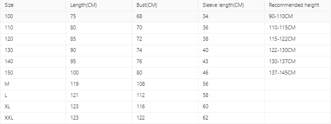 Size: 100 size suitable for height 85-105cm, 110 size suitable for height 105-115cm, 120 size suitable for height 115-125cm, 130 size suitable for height 125-130cm, 140 size suitable for height 130-140cm, 150 size suitable for height 140-150cm, adult M size is suitable for weight 85-125kg, adult L size is suitable for weight 125-140kg, adult XL size is suitable for weight 140-155kg, adult size XXL is suitable for weight 155-175kg